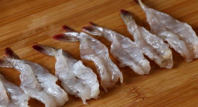 2、 大虾剥成虾仁,用刀划开背部,加入盐、料酒、白胡椒粉,用筷子拌匀腌制一下。
