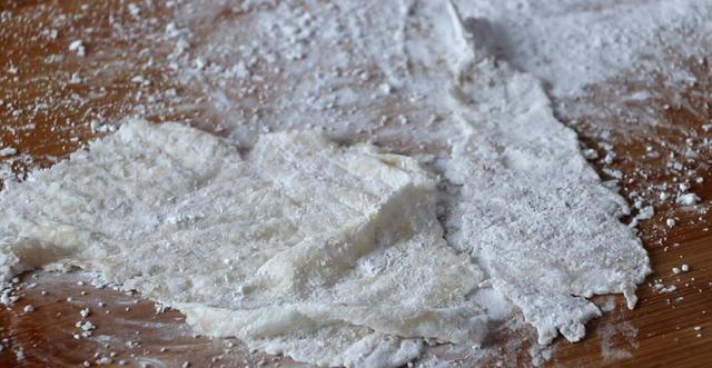 3、 把虾仁表面裹上一层薄薄的淀粉,用擀面杖敲成非常薄的片状,再把表面多余的淀粉敲掉。