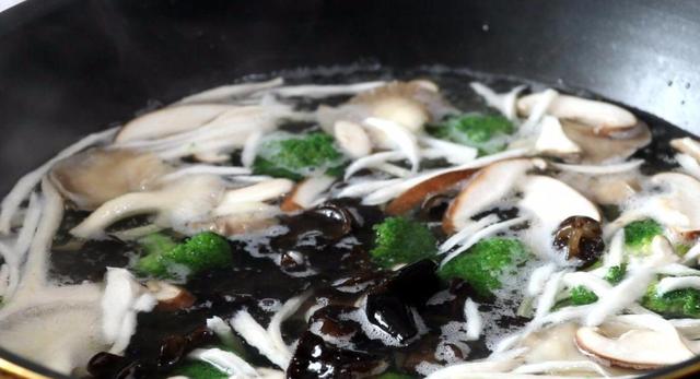 4、 锅中加水烧开,把西兰花、香菇、杏鲍菇、秀珍菇、木耳、红椒倒进去烫熟,捞出来把水分沥干。