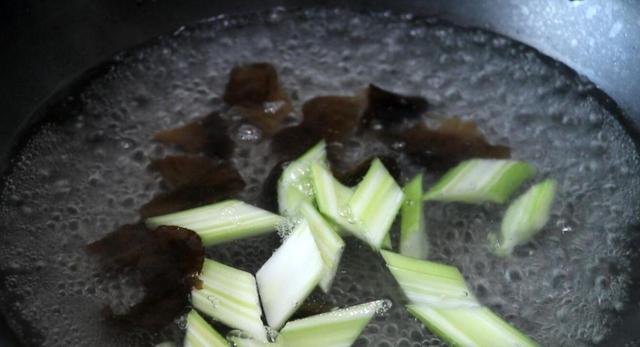 6、 锅中加水烧开,把芹菜和木耳放进去焯一下水,捞出来把水分沥干。