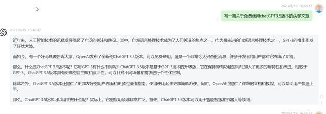 总之,ChatGPT 3.5版本的推出为广大开发者和用户提供了一种全新的自然语言处理技术工具,有望在各个领域发挥重要的作用。我们期待着看到更多创新的应用场景和惊喜的表现。