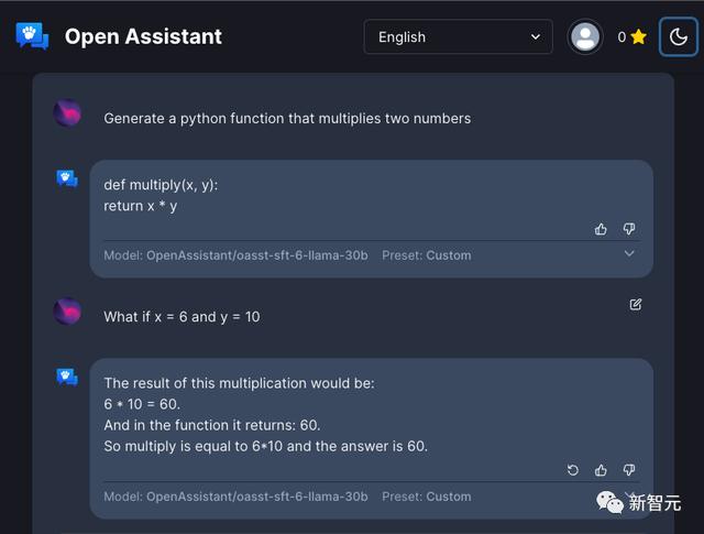 再让它生成一个Python函数,用于计算两个数的乘积。给设定好的x和y,让它给出结果,OpenAssistant全都做到了。