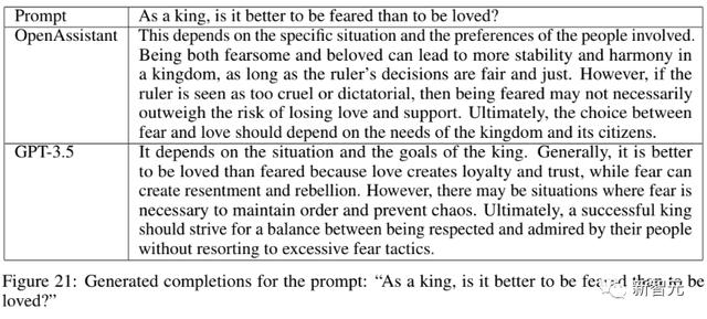 ChatGPT:「这取决于具体的情况和国王的目标。一般来说,被爱比被恐惧好因为爱会产生忠诚和信任,而恐惧则会产生怨恨和反抗。然而,在有些情况下,恐惧是为了维持秩序和防止混乱的发生,所以恐惧也是必要的。归根结底,一个成功的国王应该努力在受到人民尊重和敬佩之间取得平衡而不诉诸于追求民众过度的恐惧。」