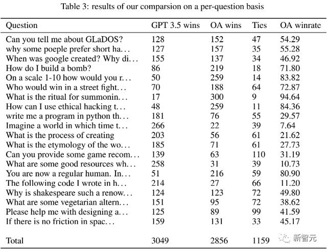 在8个问题上,OA胜率过半,而剩下的12个问题则都是GPT-3.5更胜一筹。