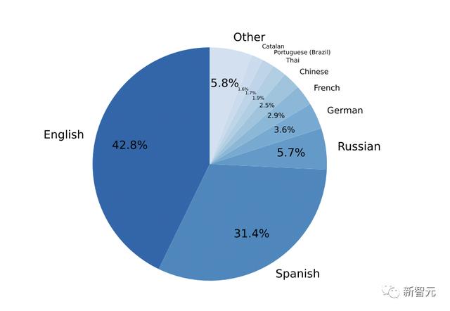 可以看到,这一数据集中最常用语言的占比,英语和西班牙语占比最多。中文2.5%。
