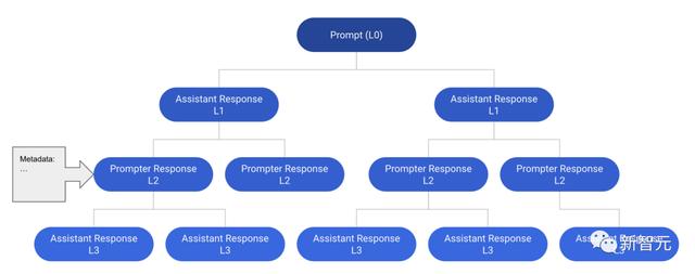 以下便是一个深度为4的对话树(CT)例子,包含12条信息。从提示到一个节点的任何路径都是一个有效的线程。