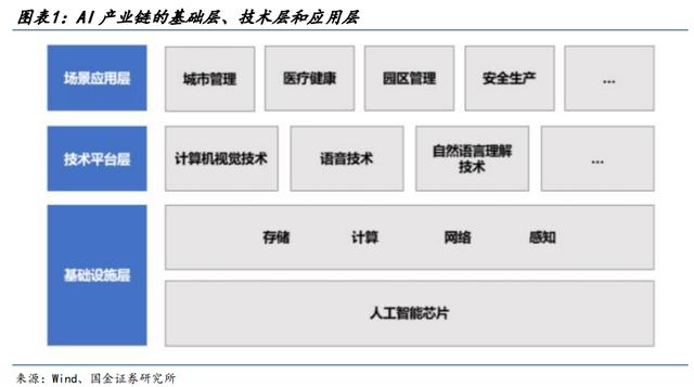 梳理产业链条,我们发现AI 行业可以分为基础层、技术层、应用层3层。一是基础层:主要包括 AI 芯片、硬件设备等。其次是技术层,包括计算机视觉、语音技术等。最后是应用层,这主要是各类应用场景的落地,包括在能源、医疗、城市管理等领域的衍伸。