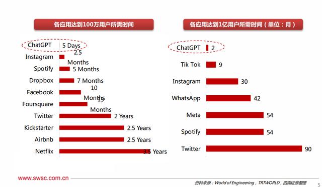 为什么这么说?首先给大家说一组数据:今年2月份ChatGPT进入A股视野时的日活用户大约是1500万人,自此之后到现在的2个多月时间chatGPT日活已经突破6000万人。但其实,ChatGPT在发布5天后即达到100万用户,是历史上用户增长最快的应用程序。