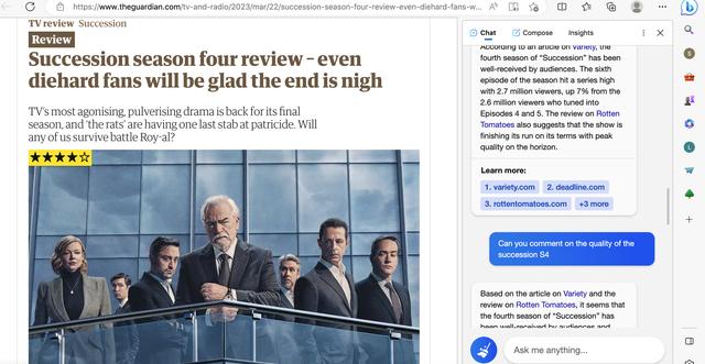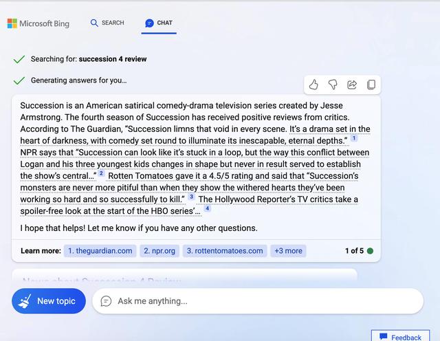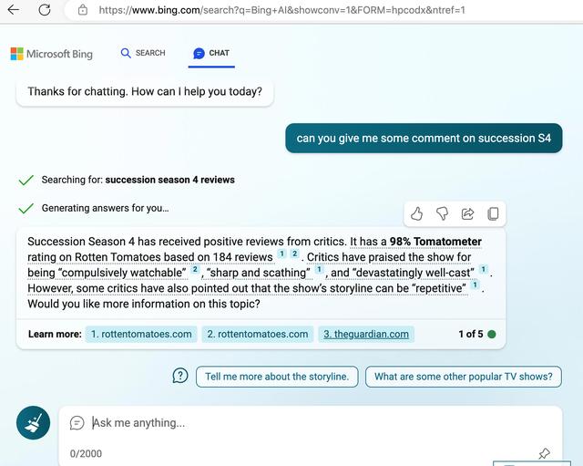 精确型回答风格是平衡型回答某种意义上的细化,面对同样的问题,答案中展示了烂番茄评分和参与评分的影评人人数,摘录了其中重要影评人的意见,还提供了正反两方意见作为参考。在答案中,Bing为每处剧评都做了来源注脚,附着在答案之后的几处链接上。