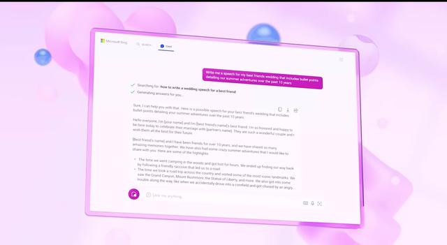 除此之外,微软官方本次还宣布,晚些时候会上线聊天记录导出和共享功能,还会进一步开放Edge浏览器对长文档的摘要能力。科技巨头在官方博客中透露,不久之后,第三方应用程序和服务将能建立在其平台之上,这意味着Bing即将Google Play化。