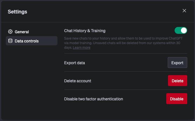 这个开关默认是开启的,即ChatGPT会保存你的对话信息,并且将你的对话信息用于训练和改进ChatGPT的数据模型。根据 ChatGPT官网的描述,关闭该选项后,你的对话信息不会被保存,也不会被用于训练ChatGPT的模型。但是你关闭这个选项之前的记录还是会被用于训练ChatGPT,意味着在从ChatGPT推出到现在的所有对话信息都会被ChatGPT用来训练它的模型。相比现在国内新推出的各种大模型,ChatGPT已经积累了巨大的先发优势。