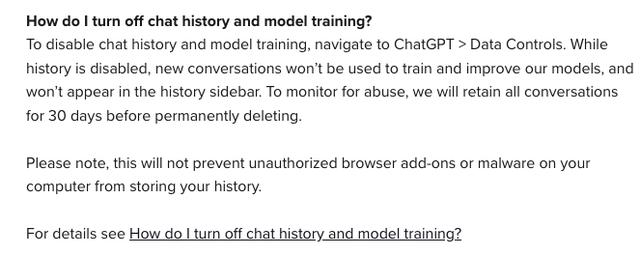 ChatGPT官网的说明中指出,关闭这个选项后,并不能阻止未经授权的浏览器插件或计算机上的恶意软件保存你的的历史记录,相当于给大家提供了另外一种思路,就是使用第三方的插件来保存历史对话信息,不过你如果连ChatGPT保存信息都不允许,你会允许其他的第三方来保存信息吗?我对此持怀疑态度。