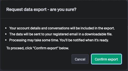 确认导出数据后,ChatGPT会将用户账户数据和对话历史数据都发送到你的注册邮箱,需要自己去邮箱下载。