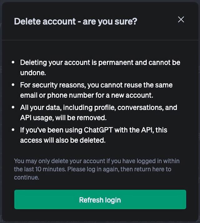 为了安全起见,ChatGPT要求你退出、重新登录,并且在重新登录后的10分钟之内操作删除账户才行,避免了别人使用你电脑的时候,把你的账户给删掉了。