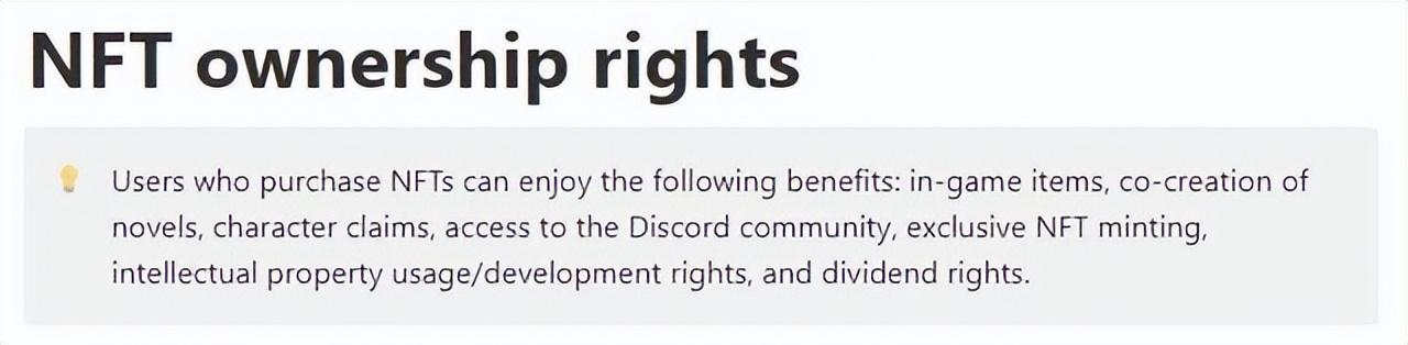 in-game items, co-creation of novels, character claims, access to the Discord community, exclusive NFT minting, intellectual property usage/development rights, and dividend rights.