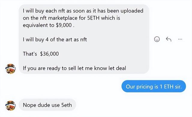 原本售价1ETH的NFT,被用户要求用5ETH强买。