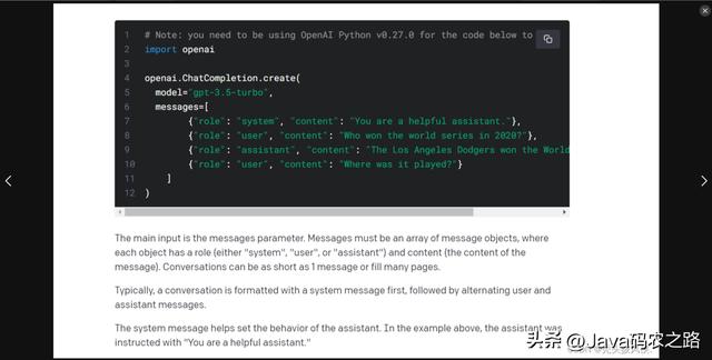一个是model,一个是messages。model根据自己的情况来选择,聊天的话就是Gpt-3.5-turbo,下面的messages里面包含n个对象,每个对象有role和content,role表示角色,content表示内容。