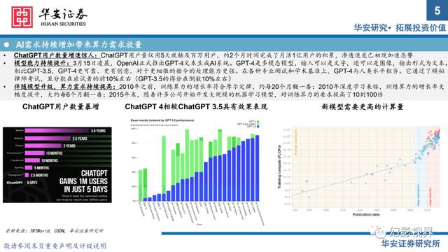 ?伴随模型升级,算力需求持续提高:2010年之前,训练算力的增长率符合摩尔定律,约每20个月翻一番;2010年深度学习来临,训练算力的增长率大幅度提升,大约每6个月翻一番;2015年末,随着许多公司开始开发大规模的机器学习模型,对训练算力的要求提高了10到100倍