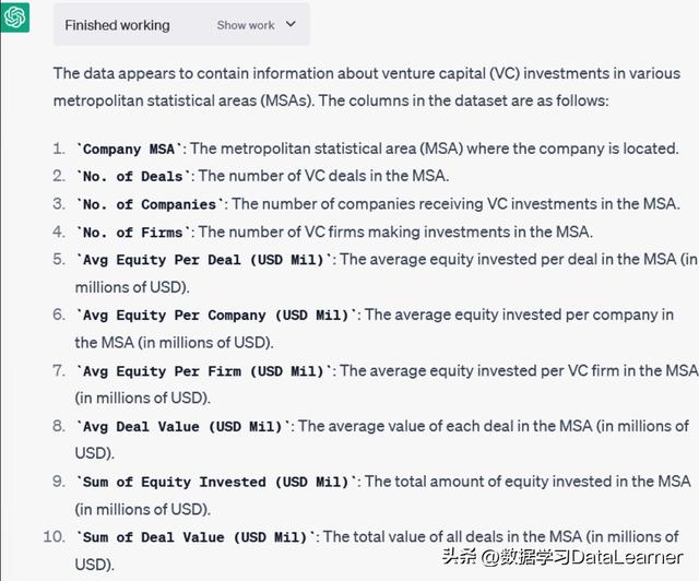 从这些列名看,如果你是专业的VC领域人员应该可以理解大部分内容。但是,即便如此,如果你不熟悉英文环境,像MSA这样的名词可能也很难理解。然而,就是这样一份数据,没有任何其它的提示,ChatGPT却可以读懂,并给出了自己的理解结果:
