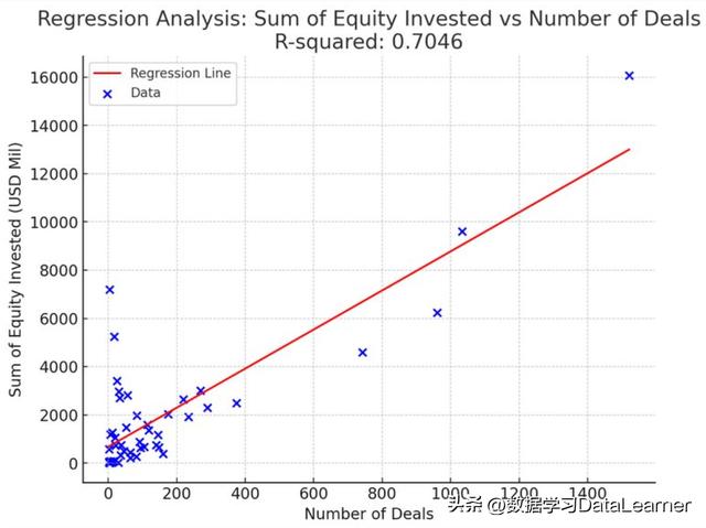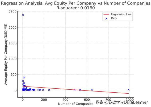 - ChatGPT对数据的回归分析和模式发现投资股权总数和交易数量之间的回归分析平均投资额度和每笔交易平均股权之间的回归分析公司数量和每个公司平均股权之间的回归分析