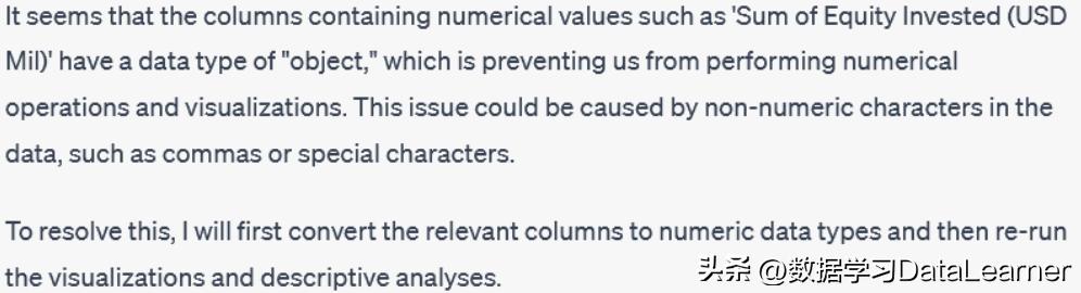 不过,需要注意的是ChatGPT并不是直接给出这三个结果。还给出了这三个图中的过程处理。尤其是关于错误处理的信息。例如,ChatGPT在处理资产投资总额的时候发现对Sum of equity Invested处理出错了,提示类型错误,所以ChatGPT又强制将这个列转成了数值类型之后再去做可视化。