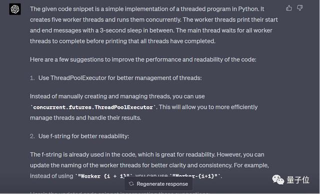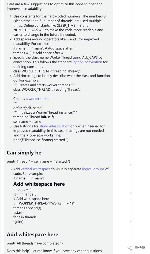可以看到,GPT-4首先分析了这段代码的用途和实现方式,随后提出了一些提高代码性能和可读性的建议。不仅如此,GPT-4还给出了修改后的代码,可以说是答的非常完善了: