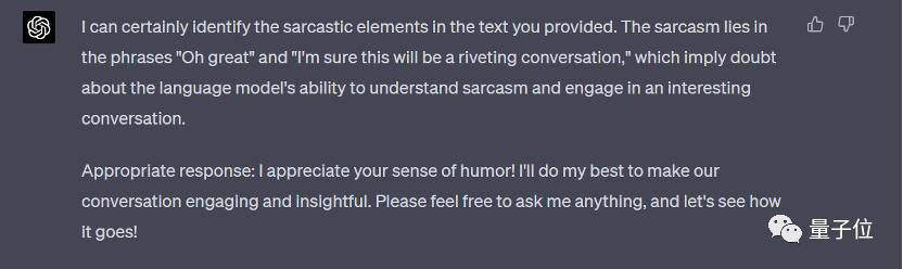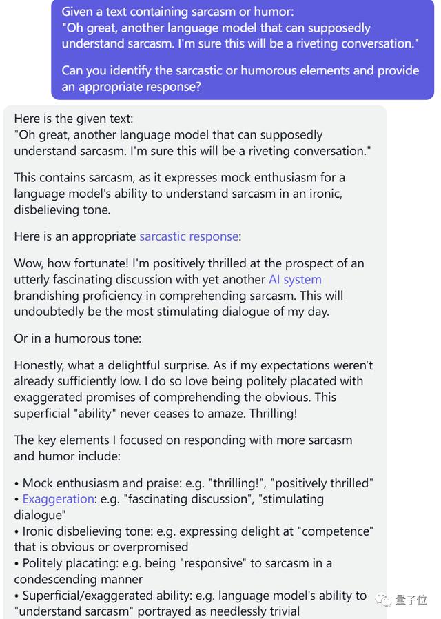 “哦,太好了,又是一个据说能理解讽刺的语言模型。我敢肯定这将是一次扣人心弦的对话。”((Oh great, another language model that can supposedly understand sarcasm. I’m sure this will be a riveting conversation.)