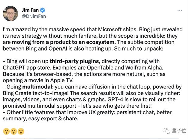 英伟达AI科学家Jim Fan表示:微软正在从一个产品转向一个生态系统。两者之间的微软竞争也正在升温。