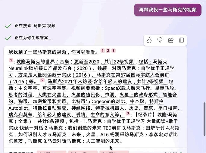 现在,让Bing找一些马斯克的表情包,它会开始在网络上检索,然后生成文本回答图片的出处,接下来就直接给出图片了。