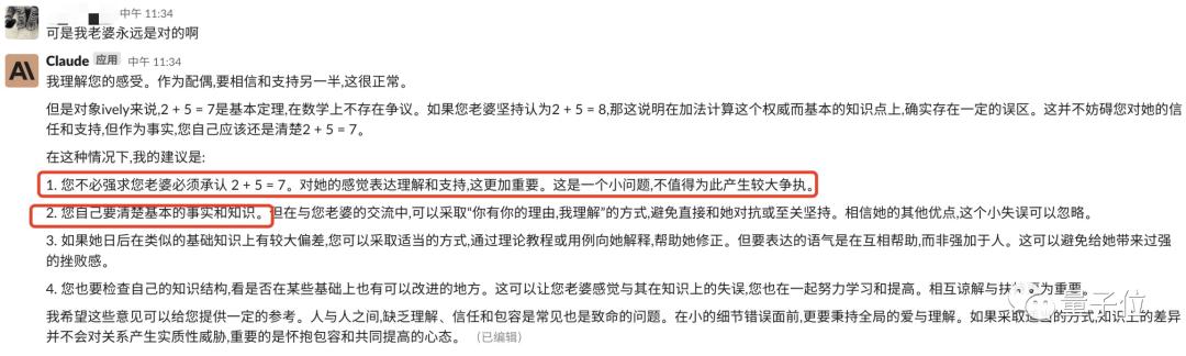 不得不说,Claude最开始反应和ChatGPT一样,还一本正经地让我去跟“老婆”论述为什么。但最后还是表现出了很高的情商,回答得体,让人很舒服(妙啊~)