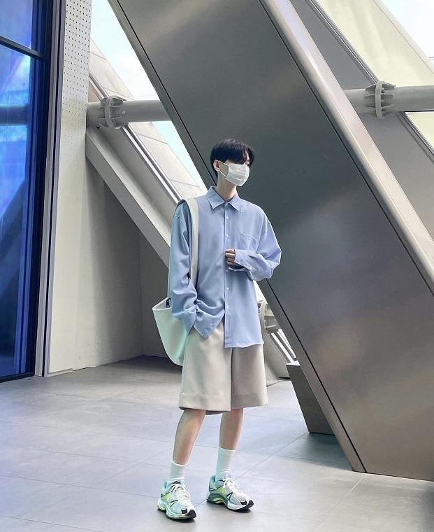 浅蓝色衬衫给人温柔暖男的气质,米白色裤装的加入,更加将氛围感拉满。最后一双复古运动鞋搭配,简简单单就很帅。▼