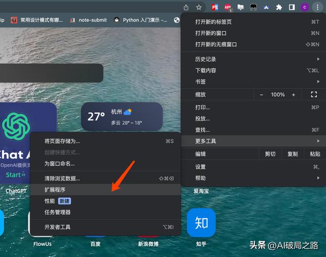 2、以 Chrome 为例,从设置->更多工具->扩展程序打开扩展程序页面,或者地址栏输入 chrome://extensions/ 按下回车打开扩展程序页面。