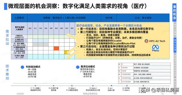 这里是医疗,我认为这可能是全球尤其是中国最大的机会了。信息化系统,模型化系统本来就有,而今天是将用更多 的大模型,在不同的纬度,在蛋白、微观的维度,在人的维度,再加上自动化,再加上机械化,未来的医疗GPT、医 院GPT,护士pilot、医生copilot, 一定有大量的机会。尤其是在中国,我觉得机会可能会更大一点,政府可以扮演更 重的角色。美国这么强大的经济,医疗占它20%,而且医疗的体验越来越差,这跟它结构有关。这个是真正意义上的 有机会,有大量的工作可以做。微软也好,Meta也好,都做了很多这方面的工作。