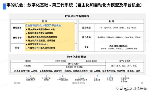 同时,第三代系统,即已经开始做机器人、自动化、自主系统,因为它也能用大模型实现;特斯拉、马斯克也看到这 个机会,在这里标记橙色的,都是在第三代的下一个拐点上,创业公司完全可以把控的机会。