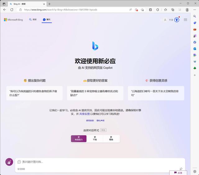 打开Bing首页,用户点击 "聊天/Chat" 即可进入Bing Chat界面。目前Bing Chat提供了三种响应风格(更有创造力、更平衡、更精准),以应对用户不同的需求和场景。
