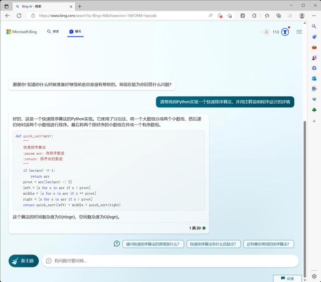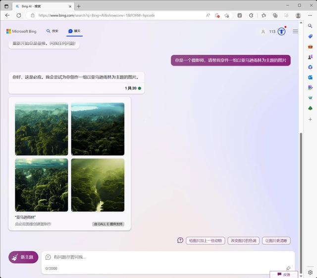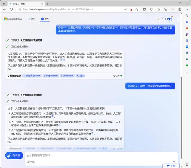 Bing Chat基于ChatGPT-4,它可以根据用户的提问,给出对应的解答,并给出相关答案的参考链接。目前单次输入最多2000字,单个主题支持20次回复,达到上限后,需开启新的主题。