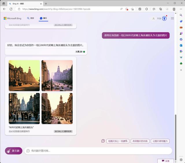 除了聊天、编程之外,Bing Chat还支持图片生成。用户通过输入图片相关提示词,Bing Chat即可在对话框中将生成的图片返回。它的图片生成引擎基于OpenAI的DALL-E模型。