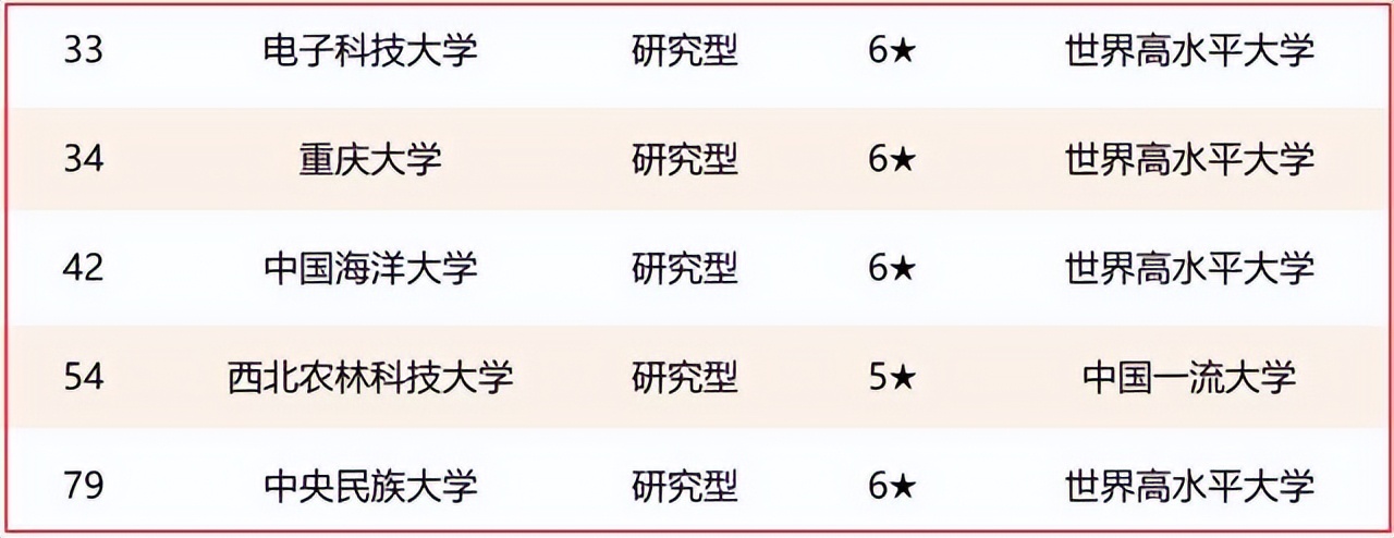 电子科技大学:全国排名第33重庆大学:全国第34名;中国海洋大学:全国第42名;西北农林科技大学:全国第54名;中央民族大学:全国第79名。
