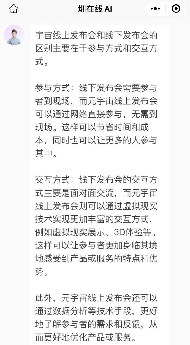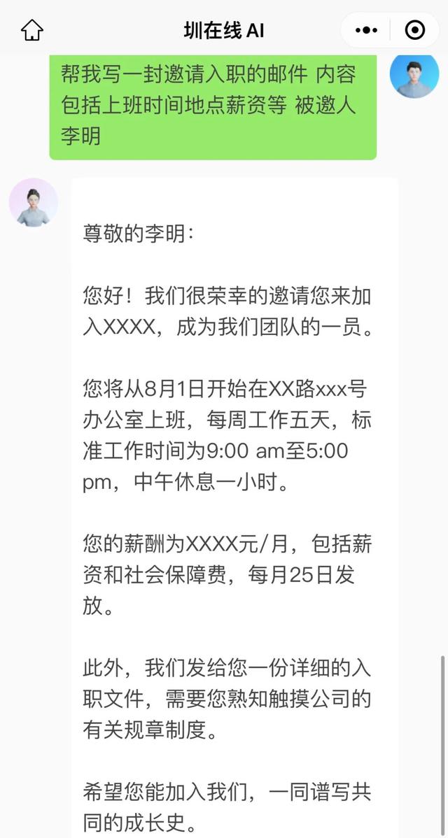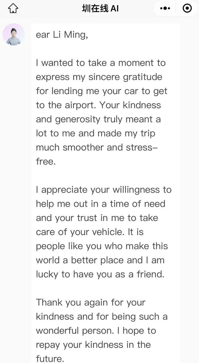 比如我问它元宇宙和线下发布会有什么区别,他能一一回答上来。在学习上,不会写英文作文信的同学不必担心,圳AI可以帮你一键解决。比如我让他写一篇关于感谢李明借我小汽车去机场的英文信。