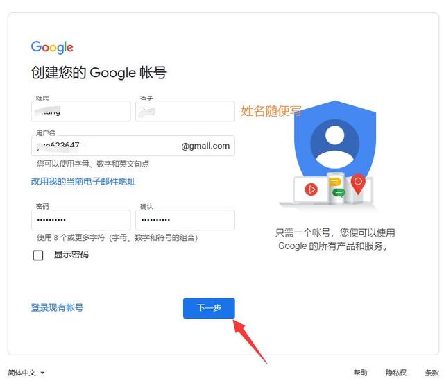 5、在信息填写页面,我们正确填写谷歌要求我们填写的信息,然后点击下一步,用户名和密码要记住哦。