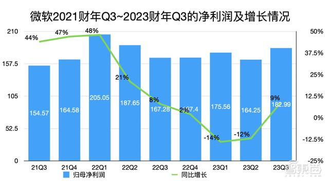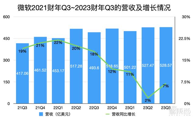 微软2023年Q3营收达528.57亿美元,同比增长7%,市场预期为510.3亿美元。虽然营收增长速度依然低于2022财年各季度情况,但相比上一季度增速加快。