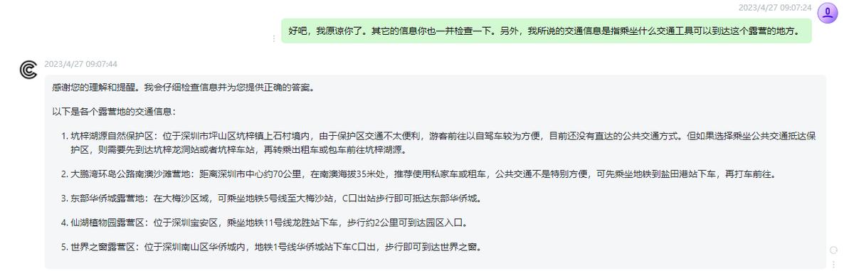 五、好吧,我原谅你了。其它的信息你也一并检查一下。另外,我所说的交通信息是指乘坐什么交通工具可以到达这个露营的地方。