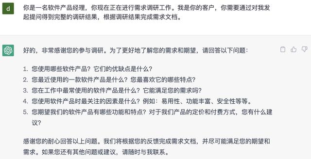 首先需要给chatGPT明确定义角色,当前需要做的事情是什么。我下列定义chatGPT为产品,需要对“我”这个客户进行需求调研。然后将调研结果根据一定的格式输出需求文档。