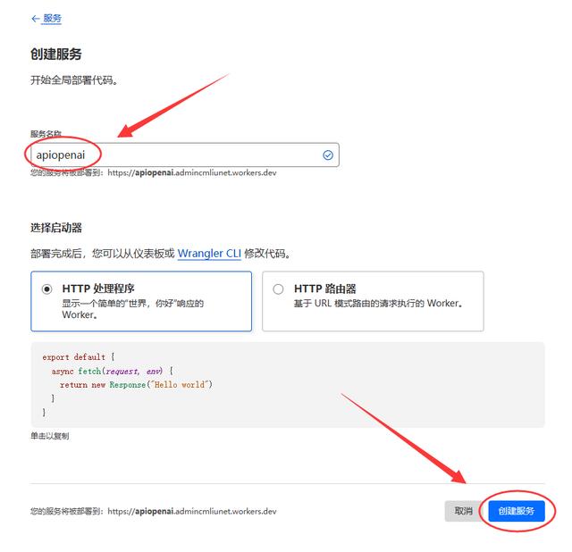 给服务名称命名“apiopenai”后选择“HTTP处理程序”,然后点击 “创建服务” 创建一个 Worker。