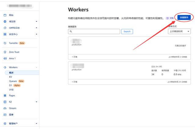 登录到 Cloudflare 的管理界面后,点击侧边栏的 “Workers” 选项,点击 “创建服务” 创建一个 Worker。
