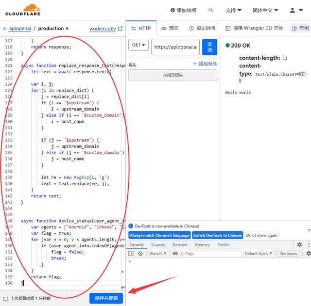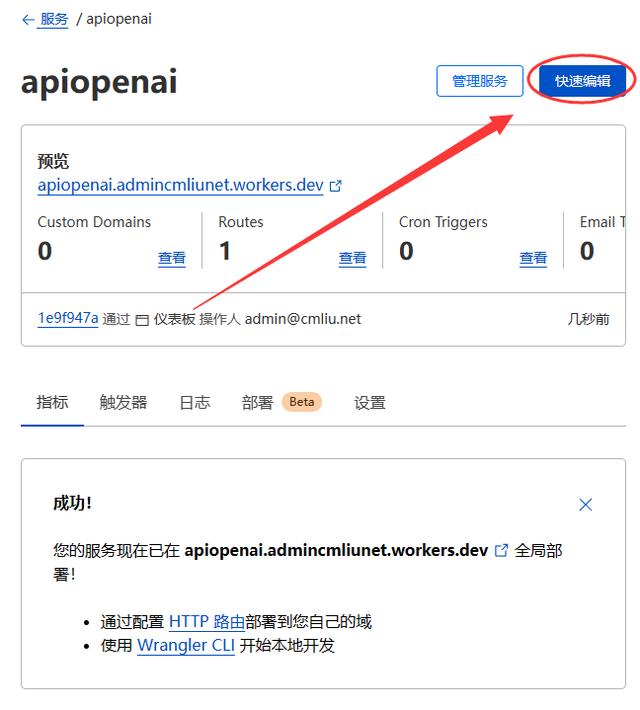 创建完成后,其中例图里的apiopenai.admincmliunet.workers.dev正是由Cloudflare 提供的子域名反代的地址,但是当前api反代并未生效,你需要点击右上角“快速编辑”