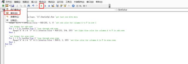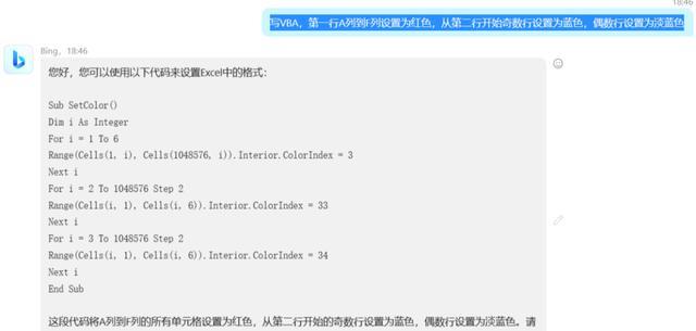 发现有点不对,为啥后面的行都设置为红色了,重新更改提示词询问:"写入VBA时,将第一行A到F列设置为红色,从第二行到最后一行,将奇数行设置为蓝色,将偶数行设置为浅蓝色"