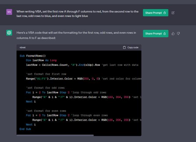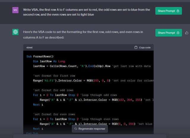 在更改提示词询问:" When writing VBA, set the background color of the first row A to F to red; from the second row to the last row, set the background color of odd rows to blue, set the background color of even rows to light blue, and do not set it if there is no data in this row."