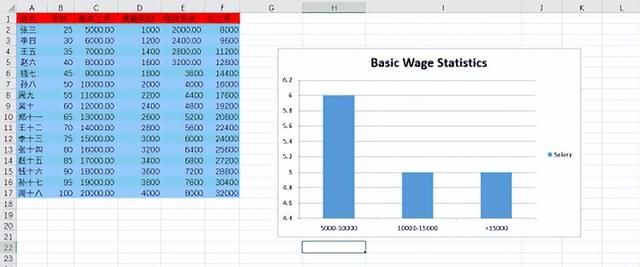 Write VBA program, in which C lists the base salary, statistics the range of the base salary, the basic salary data is C2 to C17 data, in the current work area to generate a bar chart. At the same time, it is divided into three intervals, which range from 5000 to 10,000 to 15000 and above. Note that no data can be changed.