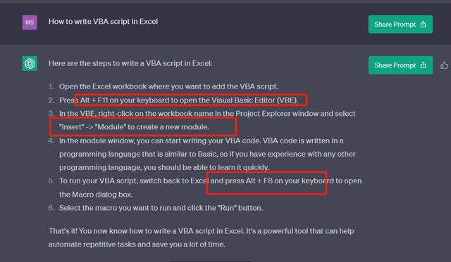 没有告诉我们具体如何新建VBA等,可以问下chatgpt,看看是否可以回单的更详细点: